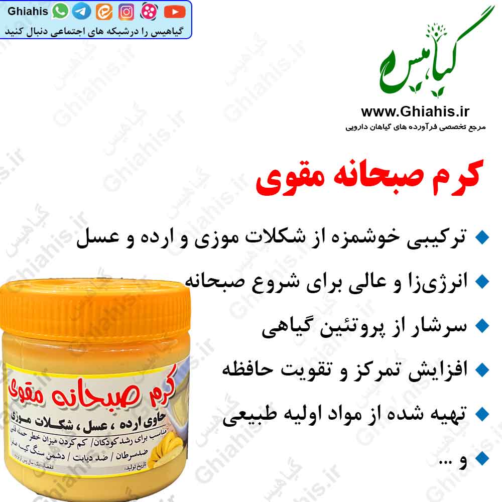 کرم صبحانه مقوی ، ترکیبی از ارده، عسل و شکلات موزی، هم خوشمزه، هم سالم، هم انرژیزاست. چه برای صبحونه، چه برای میانوعده، بهترین انتخاب برای کل خانوادهست. همین الان از عطاری آنلاین گیاهیس سفارش بده و روزت رو پرانرژی کن! 🌈